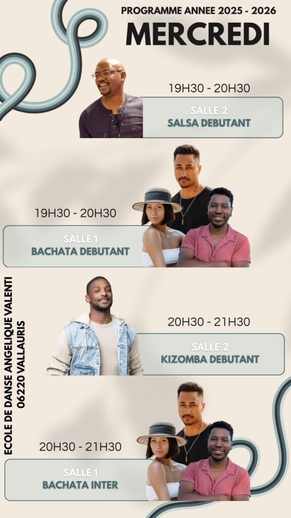 Nous proposons des cours de Bachata, Salsa et Kizomba au sein de l’école Angélique Valenti à Vallauris.